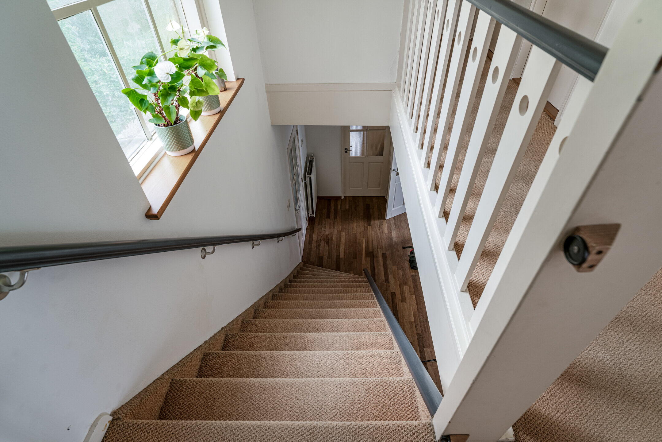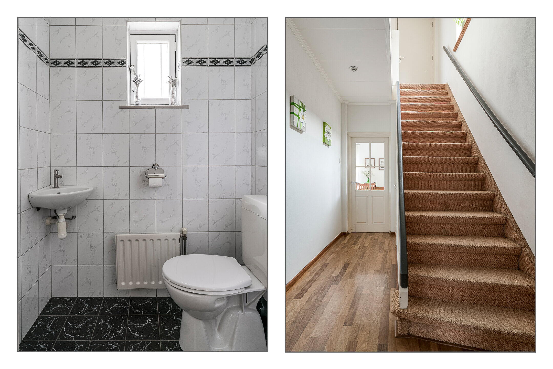 Aansluitend bevindt zich een tweede hal met trapopgang, toilet en toegang tot de praktijkruimte. De wasruimte bevindt zich in het halletje waar ook de toegang is naar de achtertuin. De kelderkast met trap naar de ruime provisiekelder met aangrenzende stookruimte is tevens vanaf de hal te bereiken.