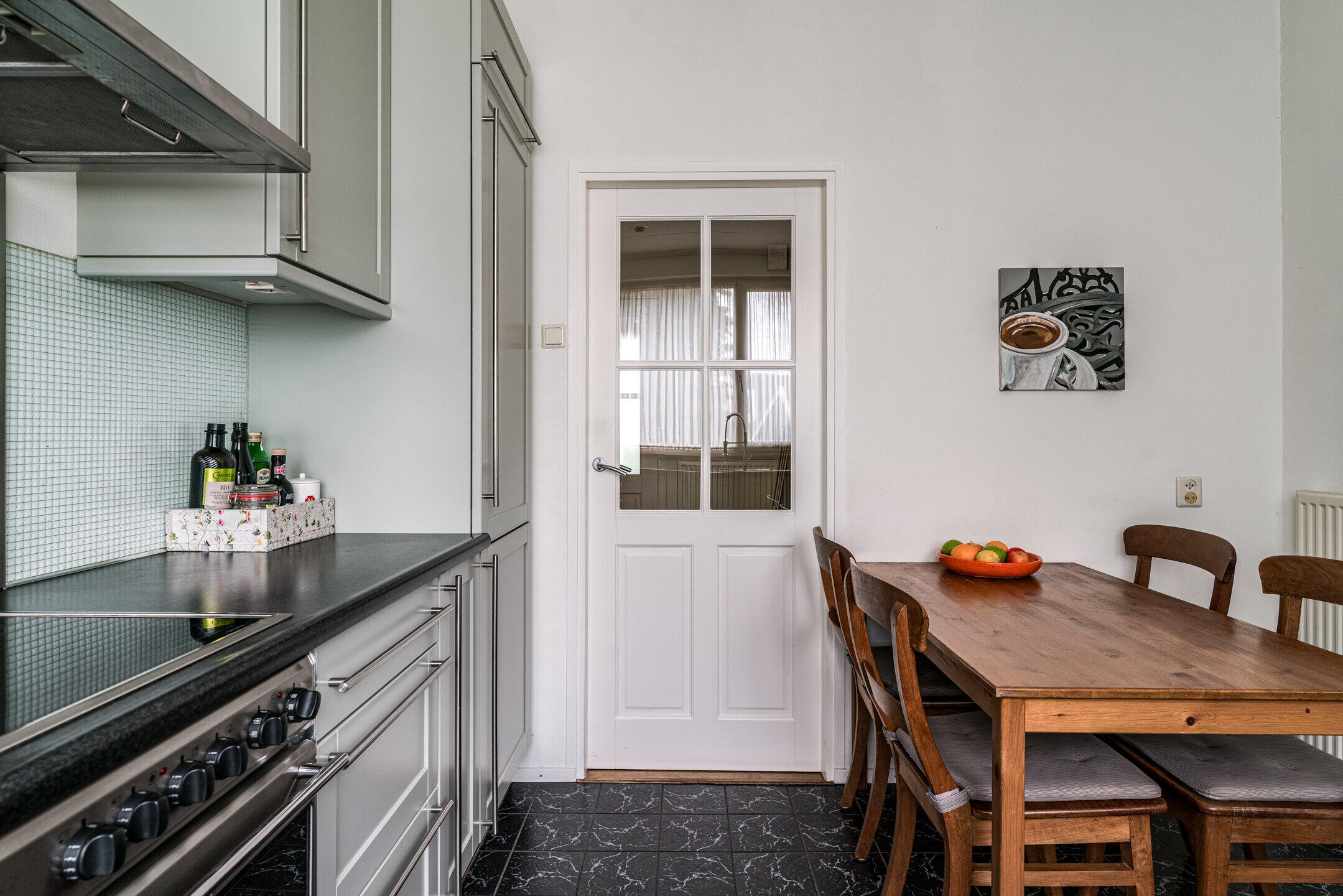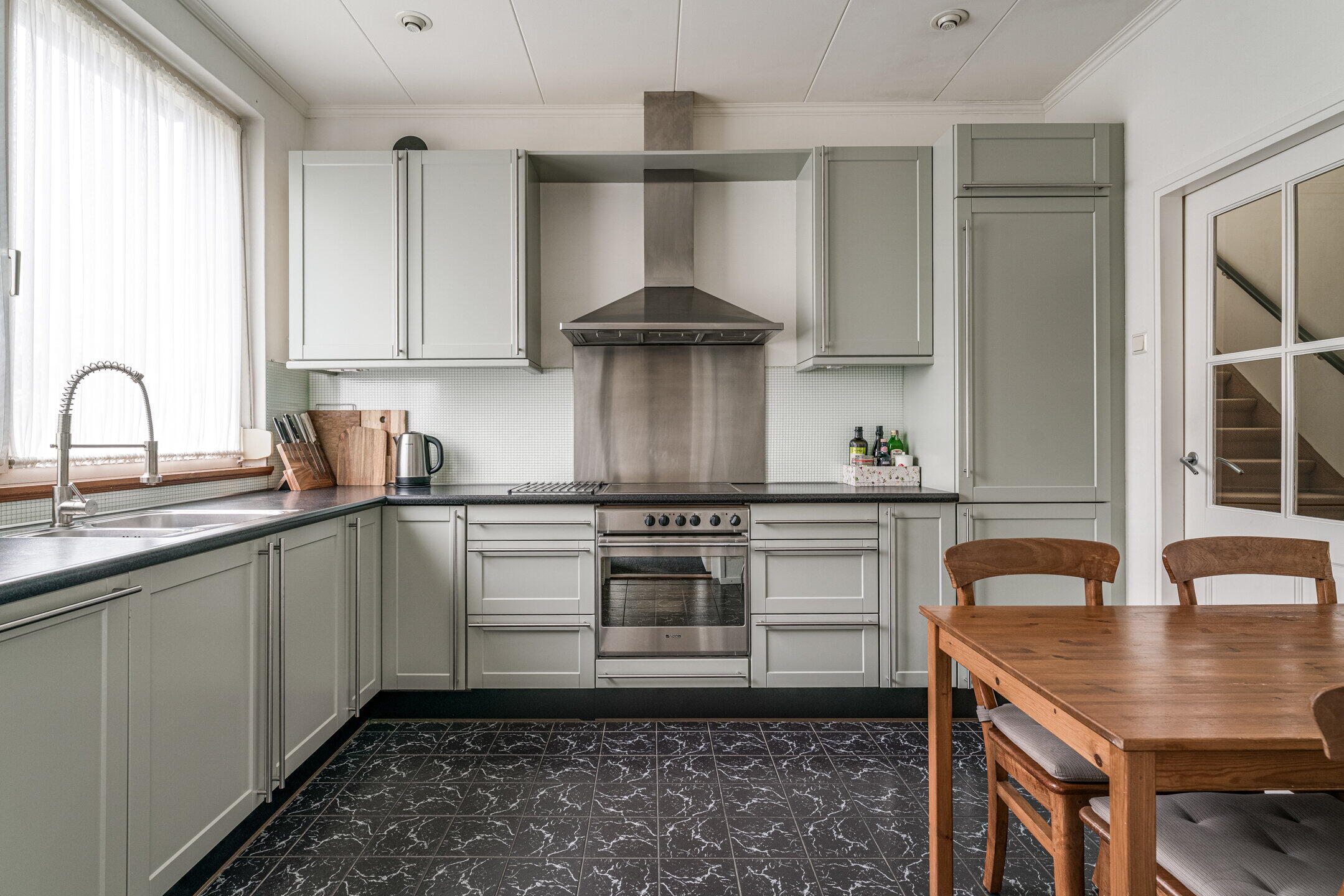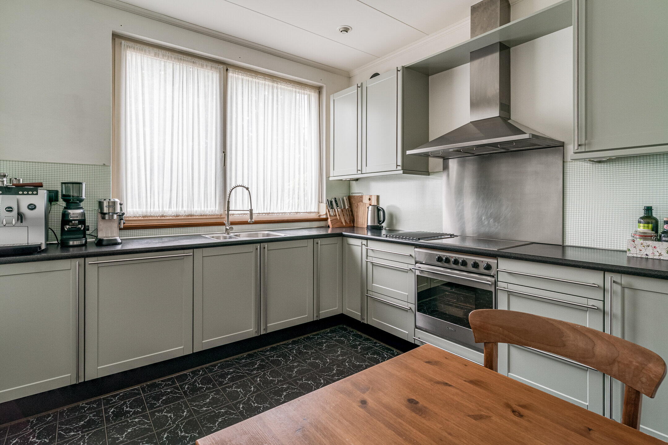 Via de entree kom je in de hal met garderobe en kastruimte met directe toegang tot zowel de praktijkruimte (door de huidige eigenaar gebruikt als salon) als de eetkeuken. De gesloten eetkeuken is uitgevoerd met een fraaie hoekopstelling en beschikt over een royaal werkblad en diverse inbouwapparatuur zoals een koel-vriescombinatie met drie vrieslades, vaatwasser, keramische kookplaat met RVS afzuigkap, heteluchtoven en handige hoekcarrousel.