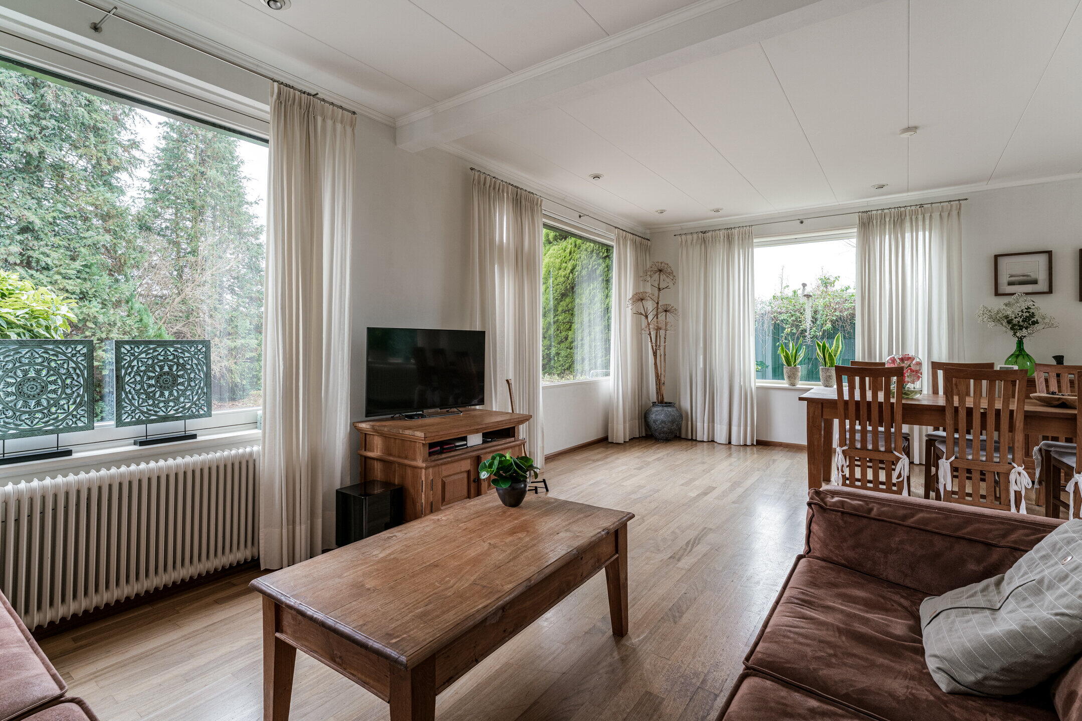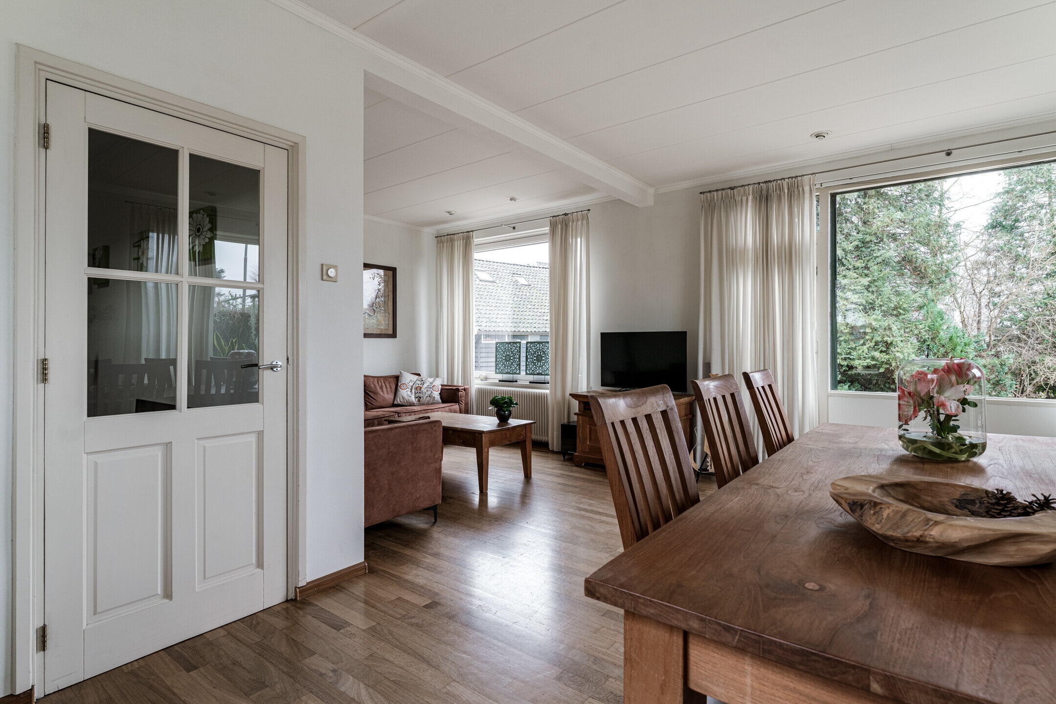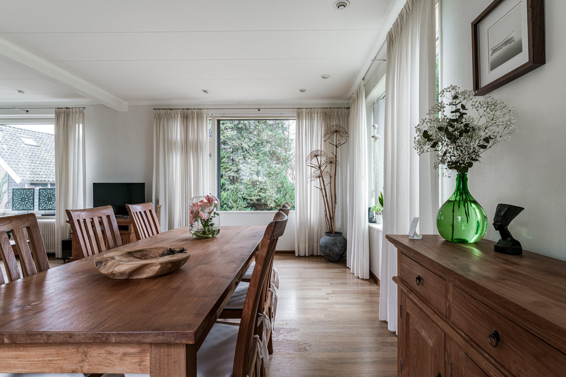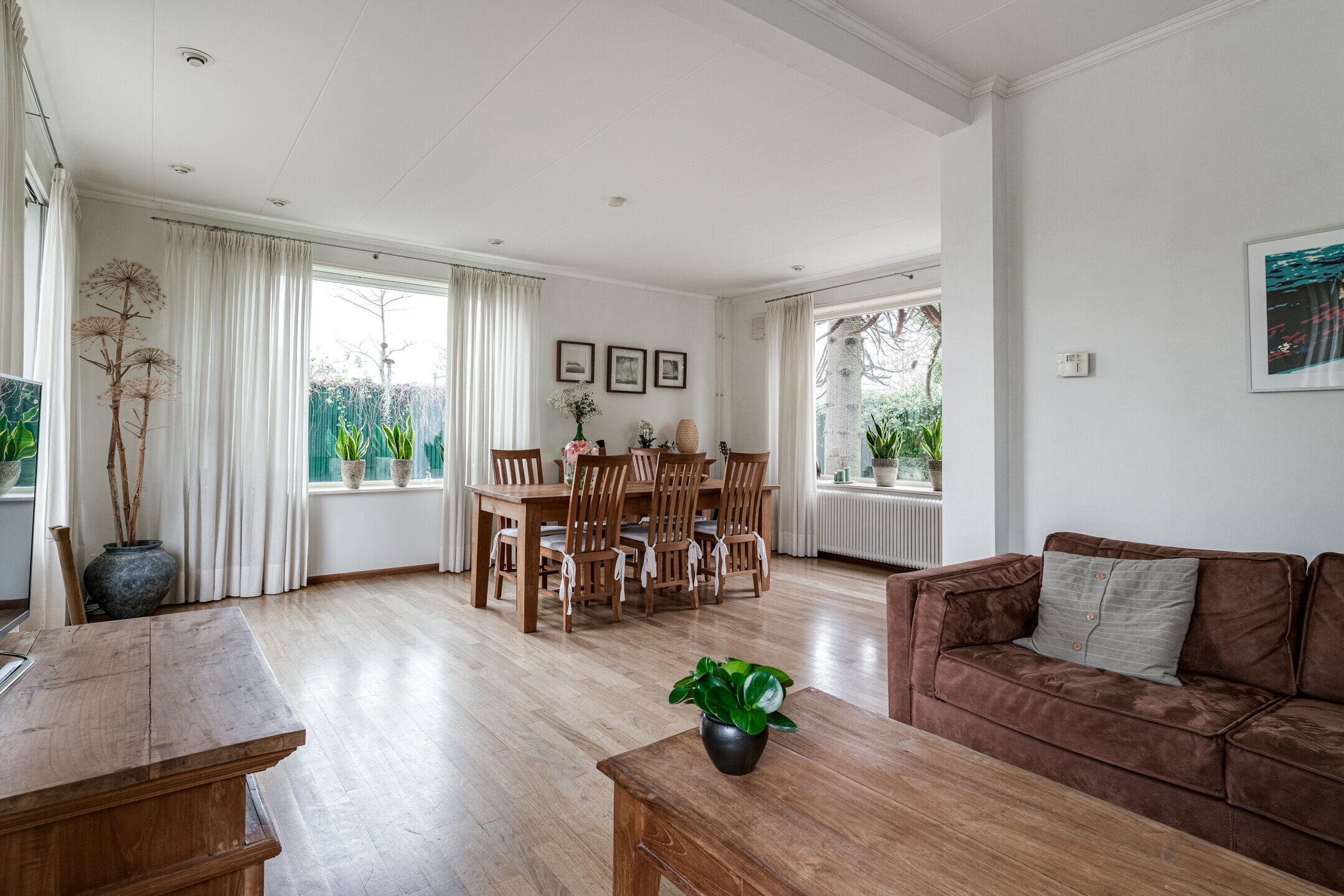 De royale L-vormige woonkamer is afgewerkt met massief houten vloerdelen en kenmerkt zich door de grote raampartijen die zorgen voor een prettige lichtinval en een fraai uitzicht op de groen omliggende tuin.