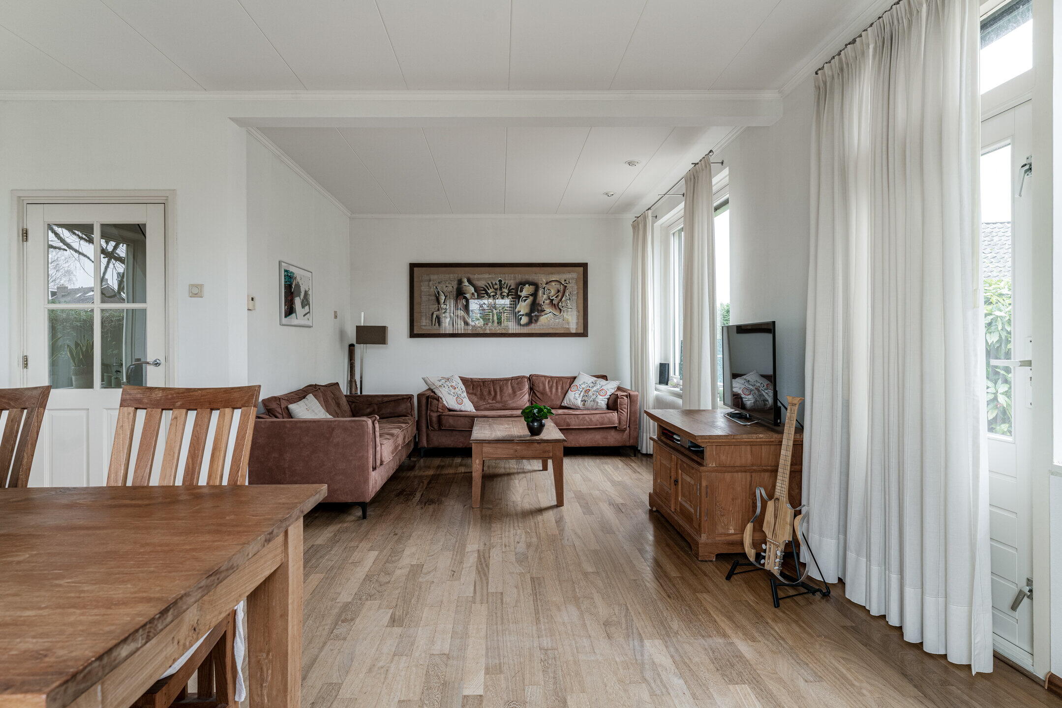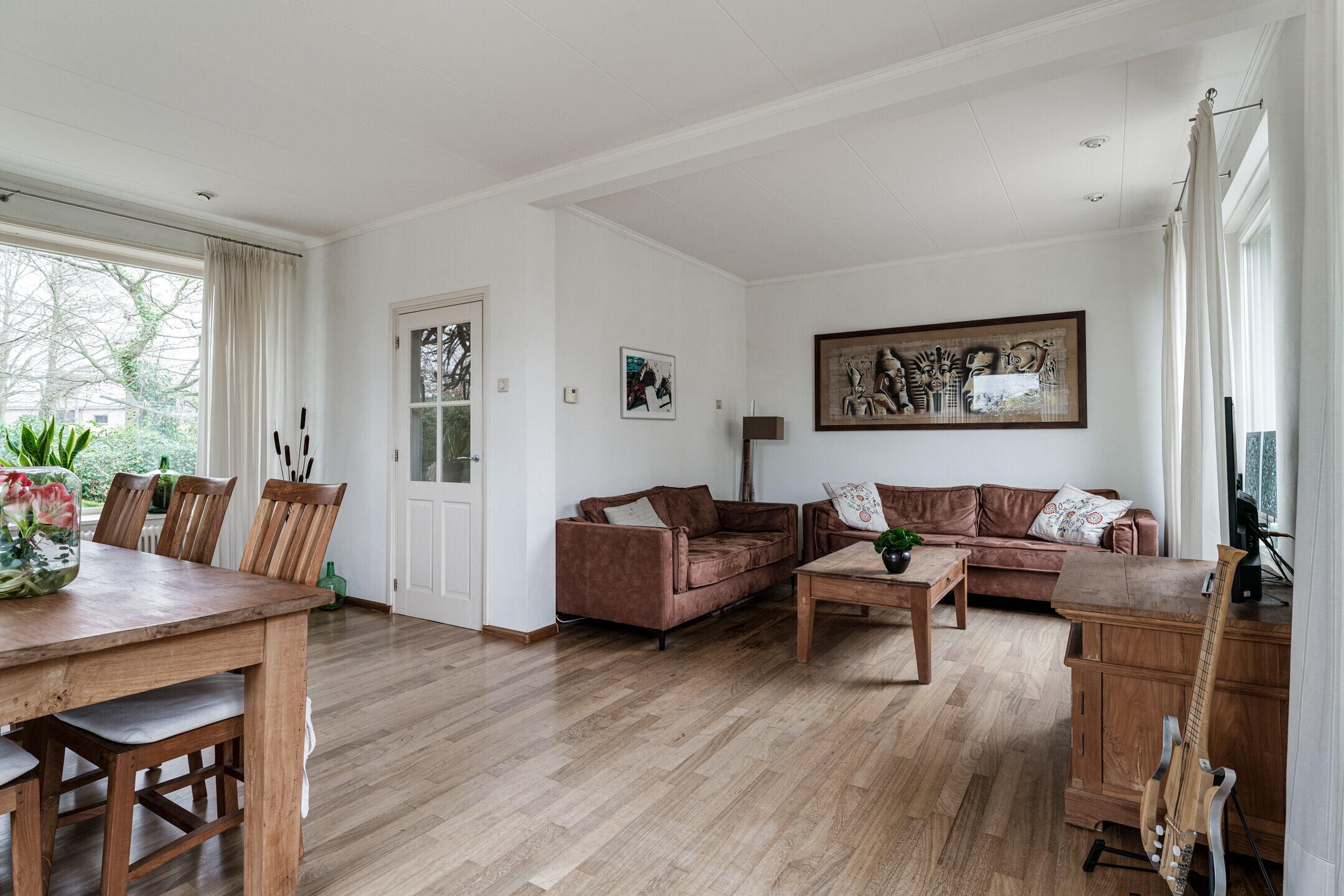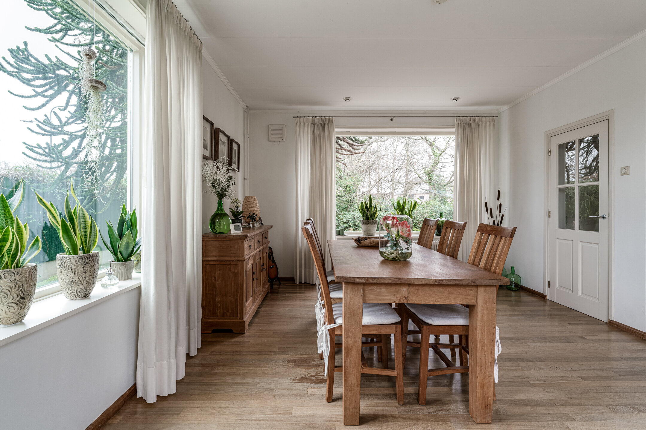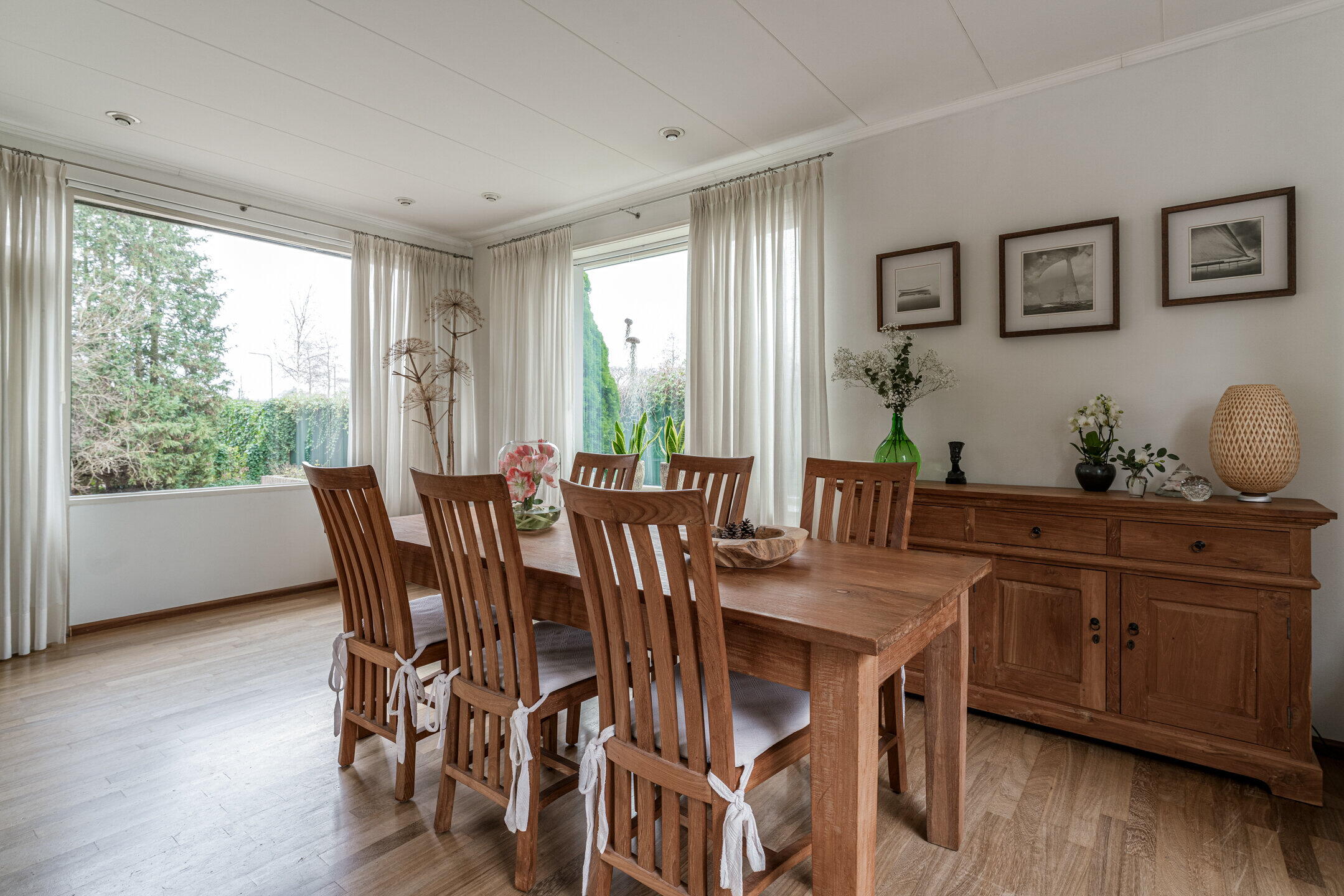 De royale L-vormige woonkamer is afgewerkt met massief houten vloerdelen en kenmerkt zich door de grote raampartijen die zorgen voor een prettige lichtinval en een fraai uitzicht op de groen omliggende tuin.