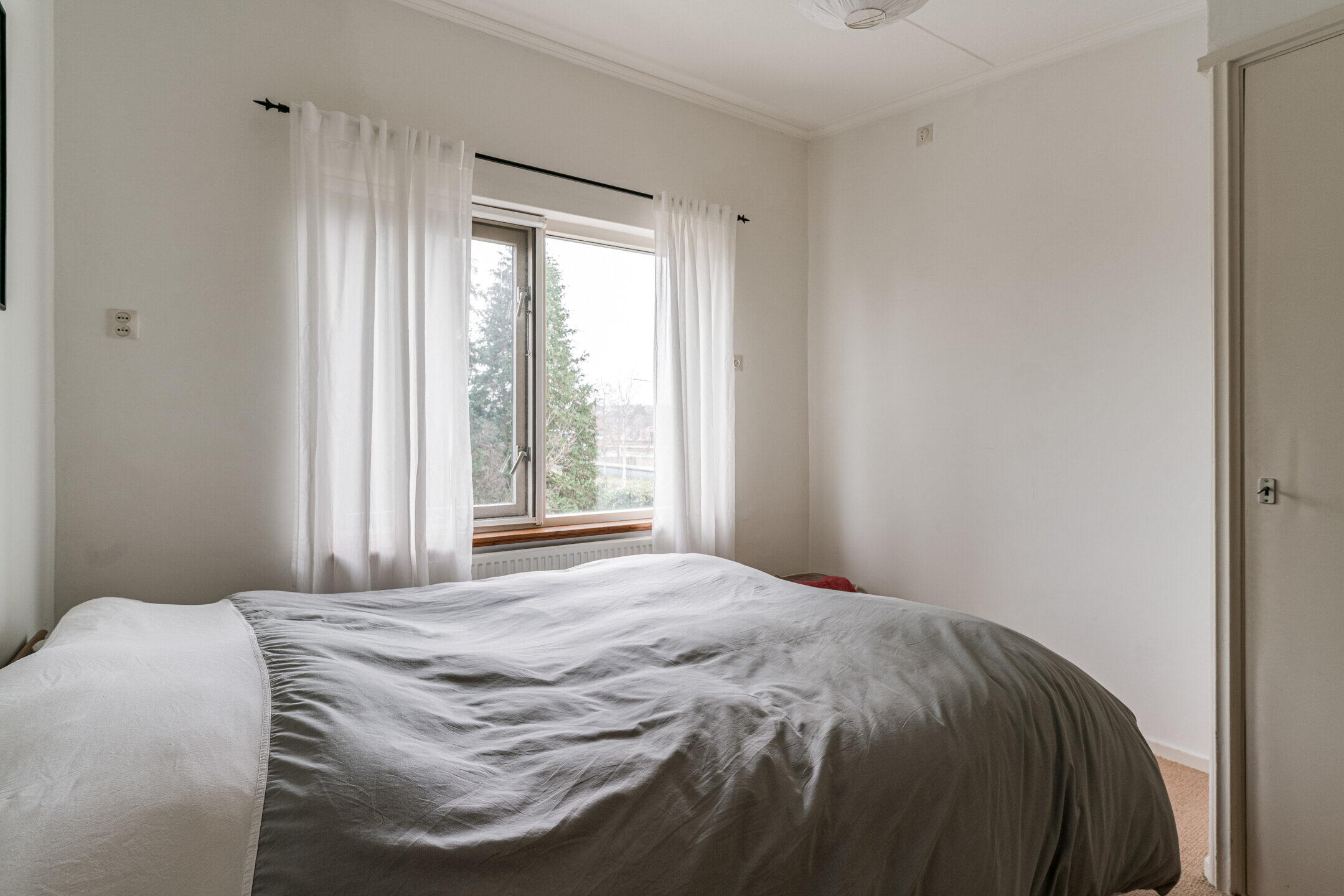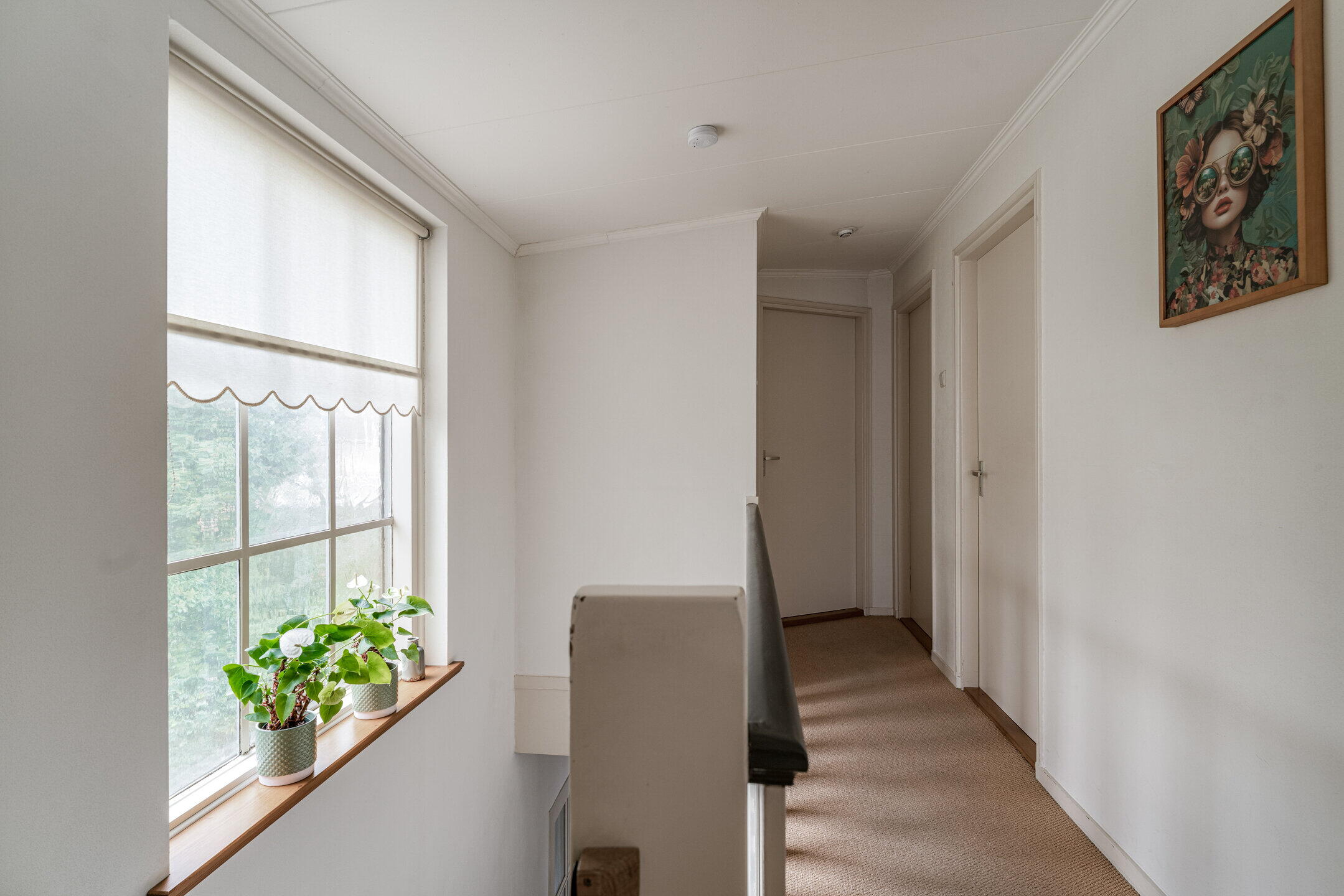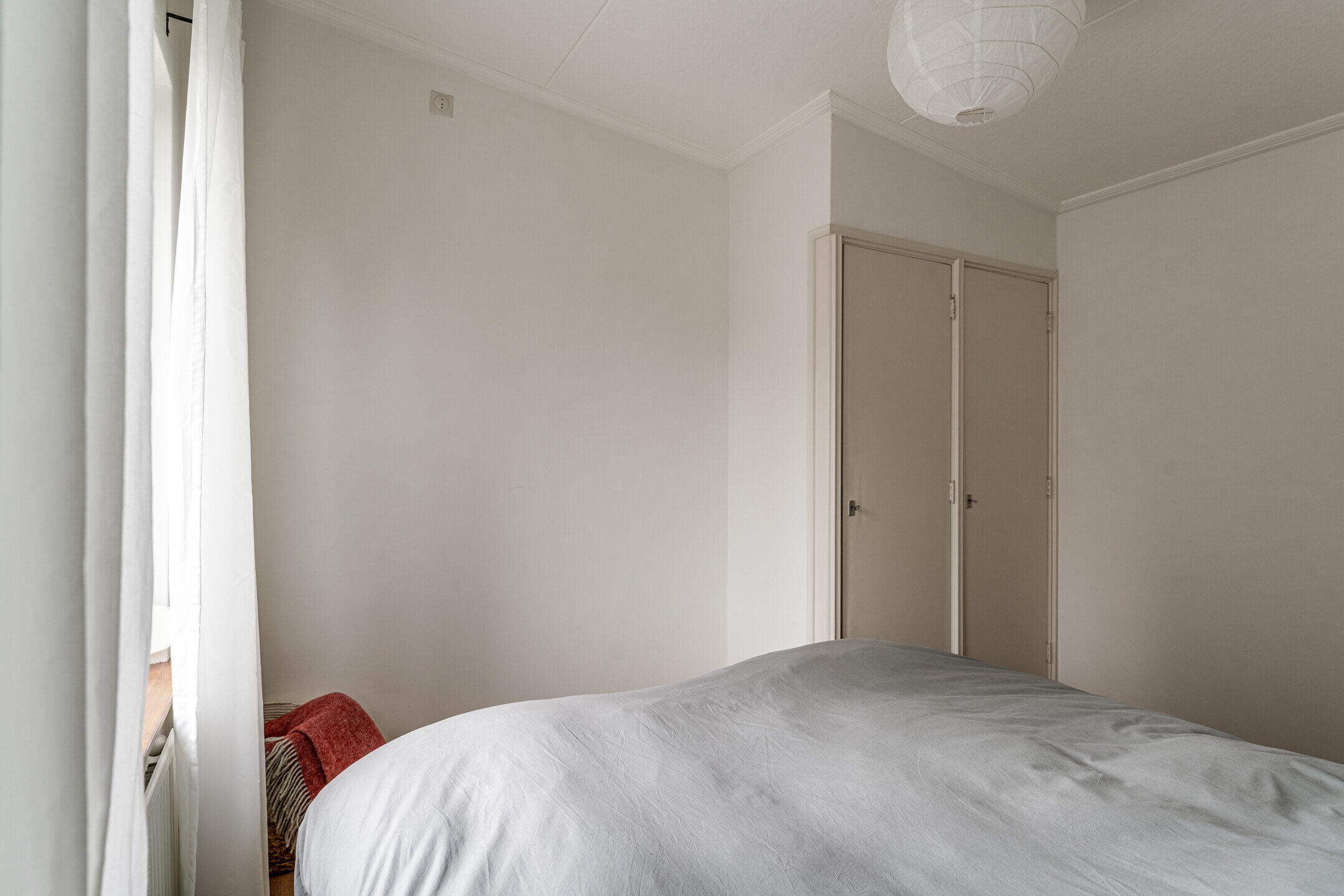 Overloop met inbouwkast. De royale ouderslaapkamer is voorzien van laminaatvloer, diverse garderobekasten en een deur naar het balkon. Daarnaast zijn er twee goed bemeten slaapkamers, beide eveneens met praktische inbouwkasten.