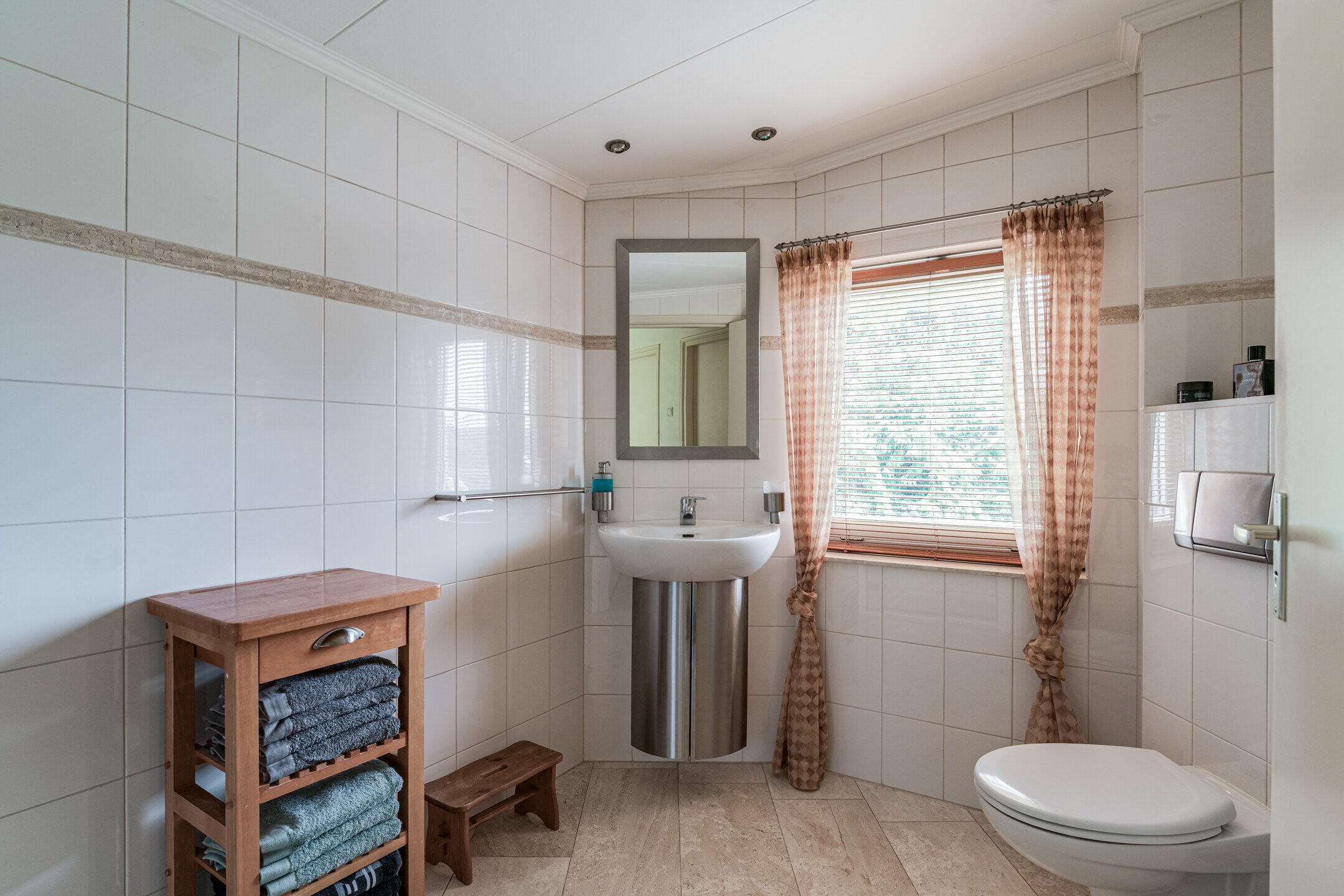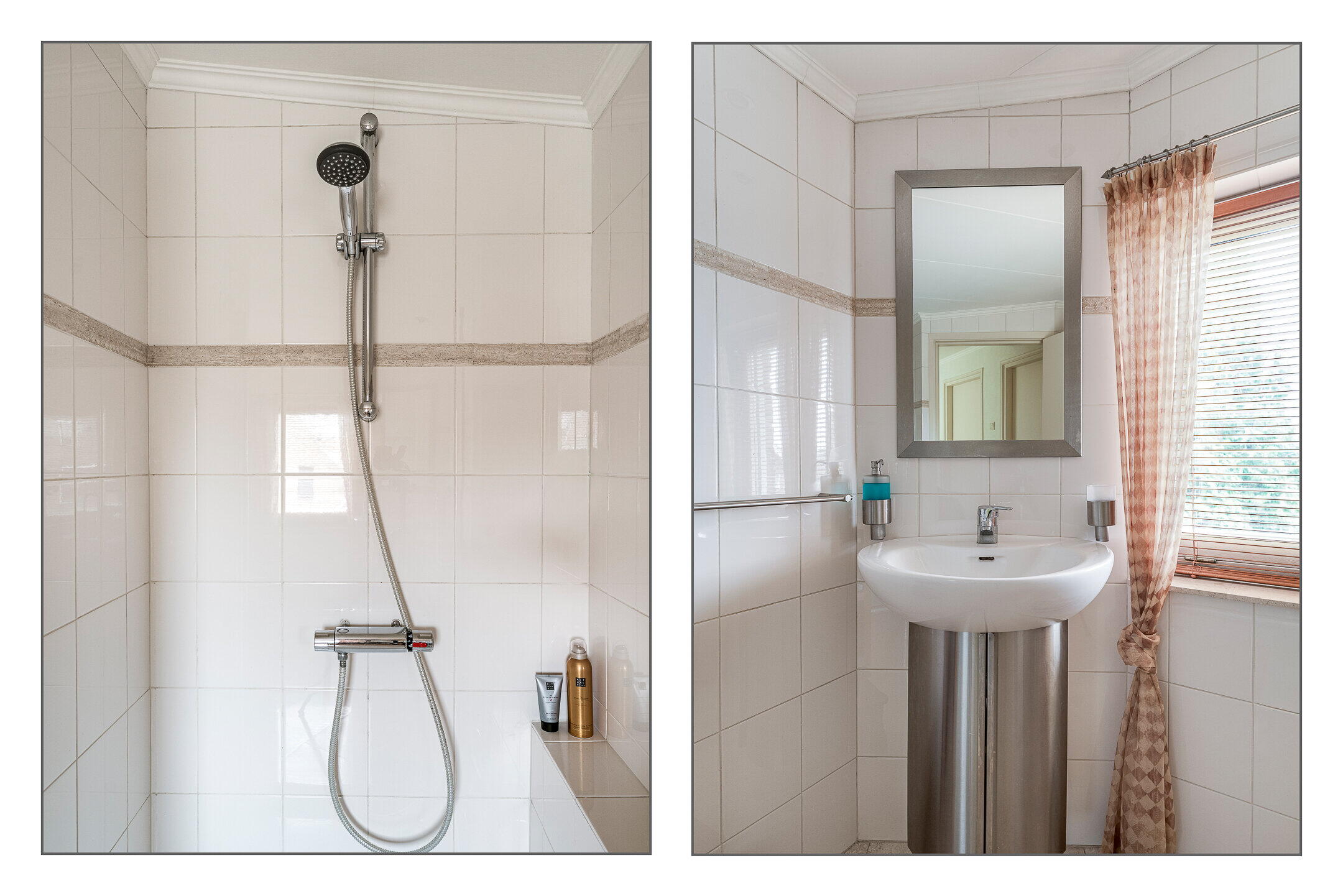 De badkamer is uitgevoerd in een lichte kleurstelling en geheel betegeld met natuursteen. Voorzien van een ruime inloopdouche, tweede toilet, wastafelmeubel, designradiator en plafond met inbouwverlichting.
